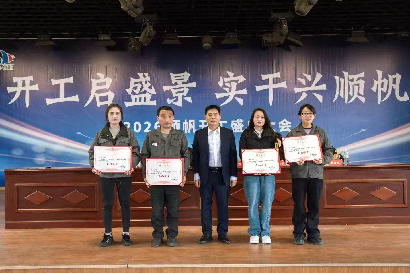 有请浙江顺帆工贸有限公司总经理王蓓蓓、副总经理严南涛、财务部总监金群英、销售总经理熊建民上台,为获奖员工颁发荣誉证书!